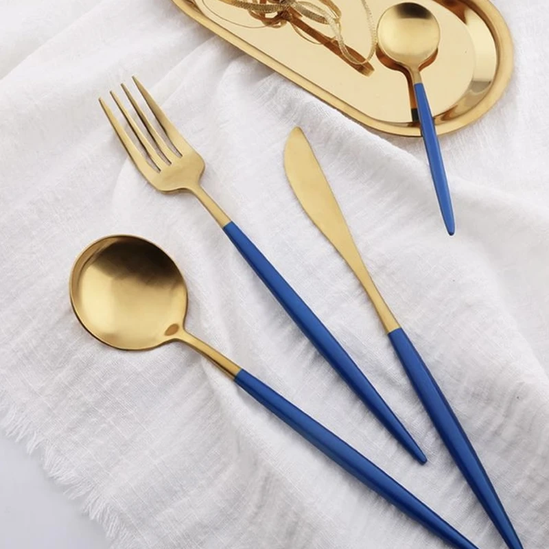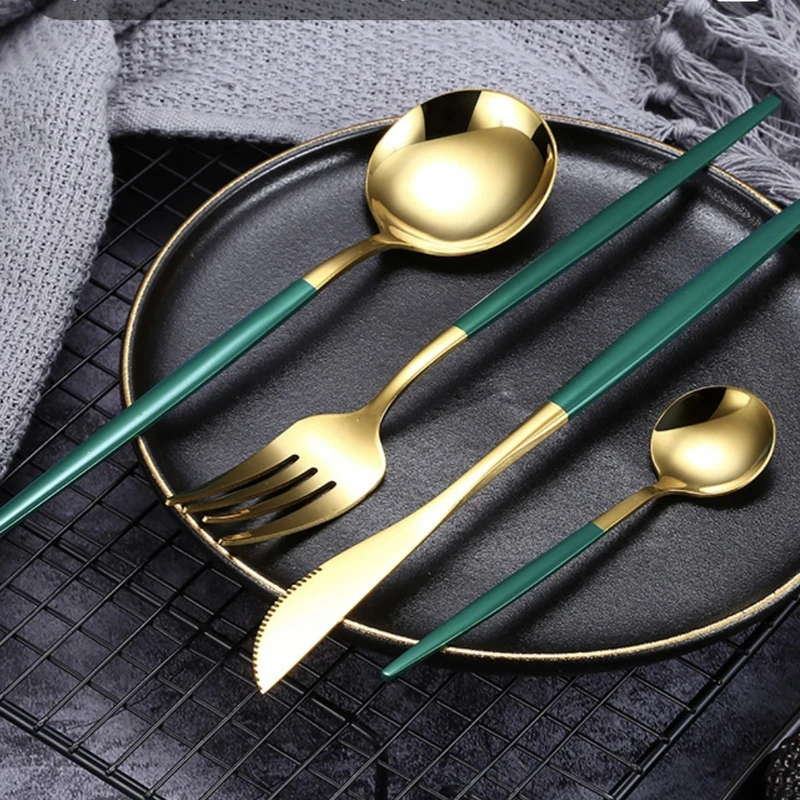 سرویس 24 پارچه قاشق و چنگال ،6 عدد قاشق غذاخوری ، 6عدد چنگال غذا خوری و 6 عددقاشق مربا خوری و 6 عددکارد غذا خوری ،با بالاترین کیفیت متریال و آبکاری و بهترین طراحی با بسته بندی زیبا ،با آبکاری طلایی،طلایی مشکی،طلایی صورتی،طلایی سبز،طلایی آبی است.