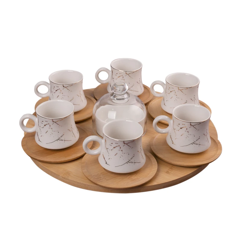 این سرویس شامل 6فنجان سرامیکی لعاب خورده ک قابل شسشتو با ماشین ظرفشویی و یک عدد پایه چوبی بامبو و 6 عدد نعلبکی و ی قندان می باشد این ظروف علاوه بر برخورداری از ظاهری زیبا و مدرن انتخاب مناسبی برای سرو قهوه و چای محسوب می شوند. از سوی دیگر وزن بسیار سبک ظروف بامبو می تواند مزیتی مهم شمرده شود و شما را از زحمات اضافی معاف کند.