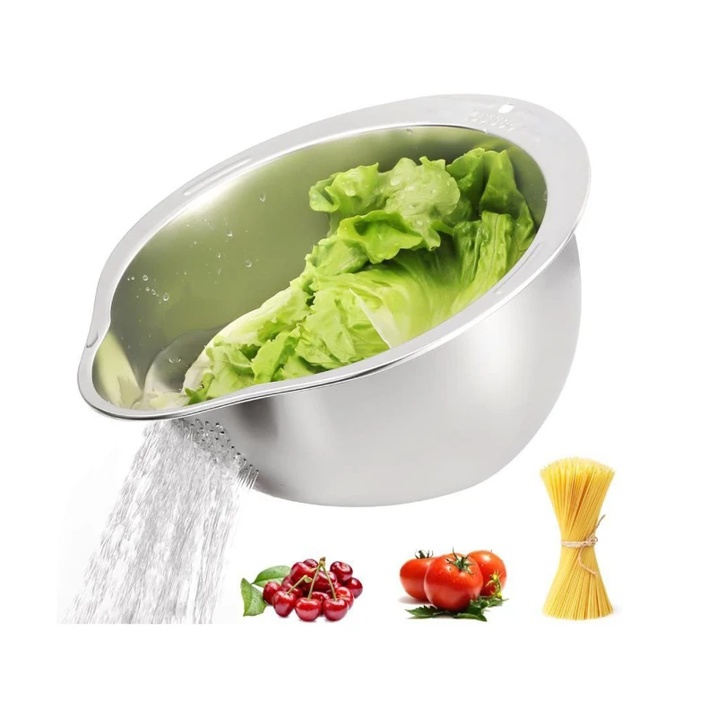 ست سبد و لگن جادویی اشپزخانه از جنس استیل بسیار با کیفیت که در قالب یک ظرف هم لگن و هم سبد تعبیه شده است و به خاطر شکل خاصی که دارد بسیار راحت داخل سینک قرار میگیردو پس از ابگیری در لگن ان و شستن میوه کاهو و موارد دیگر مورد نیاز کافی است لگن 45 درجه مورب نگه دارید تا از قسمت بالایی ان اب بطور کامل خارج شود ضمنا قسمت زیرین این کالا طوری طراحی شده که هم ضد خش است و هم ضد لغزش در داخل سینک می باشد و در مجموع یک ظرف است که دارای دور کاربرد سبد و لگن همزمان میباشد ابعاد ان 28 در 25 قطر دهانه و ارتفاع ان 14 است