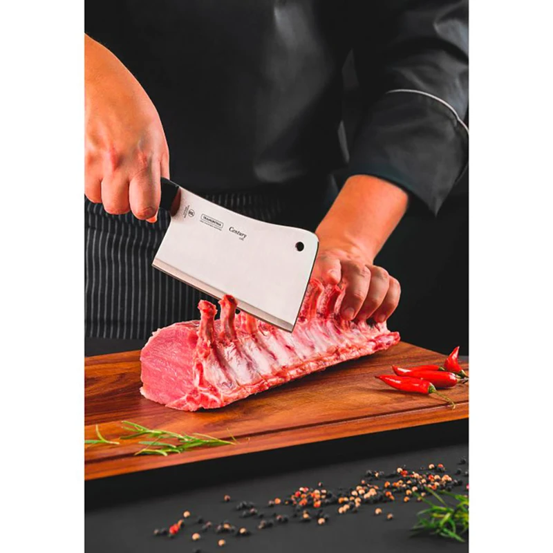برند برزیلی ترامونتینا از سازندگان به نام و معتبر ابزار و وسائل آشپزی می باشد و تخصص ویژه ای در طراحی و ساخت انواع چاقو، کارد و ابزار کارامد آشپزی با جنس استیل دارد. ساطور کد 106 از محصولات بسیار کارامد و پرطرفدار این برند مطرح برزیلی بوده و در سطح بین المللی با عنوان ساطور خردکن همه کاره شناخته می شود. این ساطور حدود 31 سانتی متر طول داشته و از دو بخش دسته و تیغه تشکیل شده است. دسته این ساطور حدود 14 سانتی متر طول داشته و از جنس چوب طبیعی بسیار محکم ساخته شده است.تیغه این ساطور حدود 16 سانتی متر طول و 10 سانتی متر عرض دارد. جنس آن از نوعی استیل با فرمولاسوین خاص ترامونتینا تهیه شده که در عین ضد زنگ بودن و مقاومت بالا بسیار تیز و برنده بوده و به راحتی امکان خرد و قطعه قطعه کردن انواع گوشت و استخوان و امور سنگین قصابی را فراهم می کند.