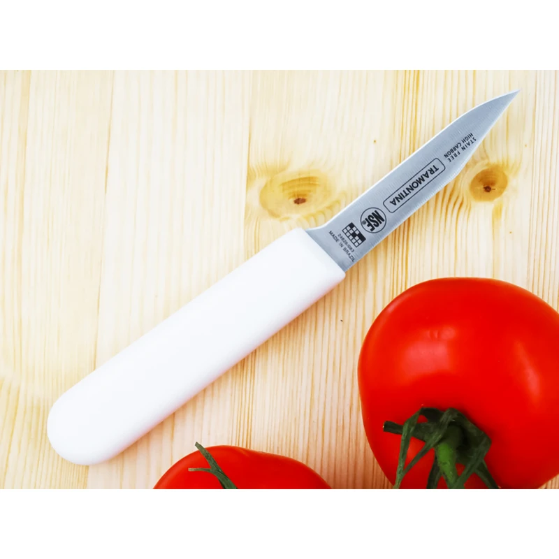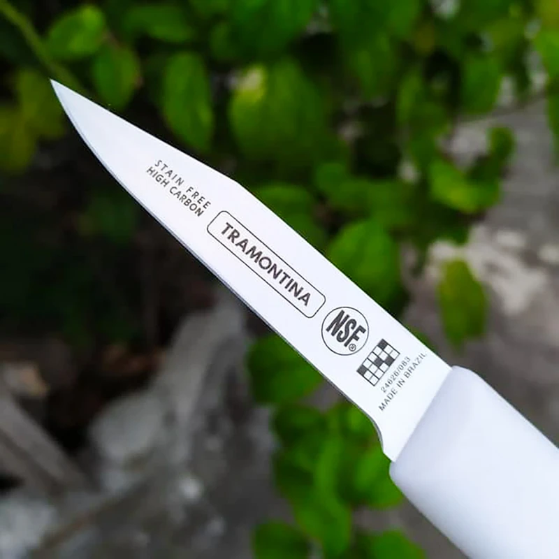 چاقوی Master از معروف ترین محصولات برند برزیلی Tramontina می باشد که در بین آشپزهای سراسر جهان از شهرت و محبوبیت بسیاری برخوردار است. این چاقو از نوع چاقوهای معروف به Paring یا اصطلاحا چاقوی پوست گیری و خرد کنی دم دستی در آشپزخانه است که ابزار دست شما در آشپزخانه خواهد بود. تیغه ای بسیار برنده و به طول حدود 9 سانتی متر و از جنس فولاد ضد زنگ با میزان کربن بالا و بسیار محکم دارد. عرض تیغه آن در پهن ترین قسمت به 1.5 سانتی متر می رسد و تیغه آن شیبی ملایم و یکنواخت دارد و بسیار برنده می باشد. دسته این محصول حدود 10 سانتی متر طول و 2 سانتی متر عرض دارد و از جنس پلاستیک محکم استخوانی ساخته شده و جنسی زبر دارد که باعث چسبندگی به دست و گریپ بسیار راحت می شود. طول کل چاقو 18 سانتی متر است.برای شستشوی این چاقو می توان از ماشین و دست استفاده کرد اما برای دوام بیشتر بهتر است بلافاصله پس از شستشو خشک گردد.